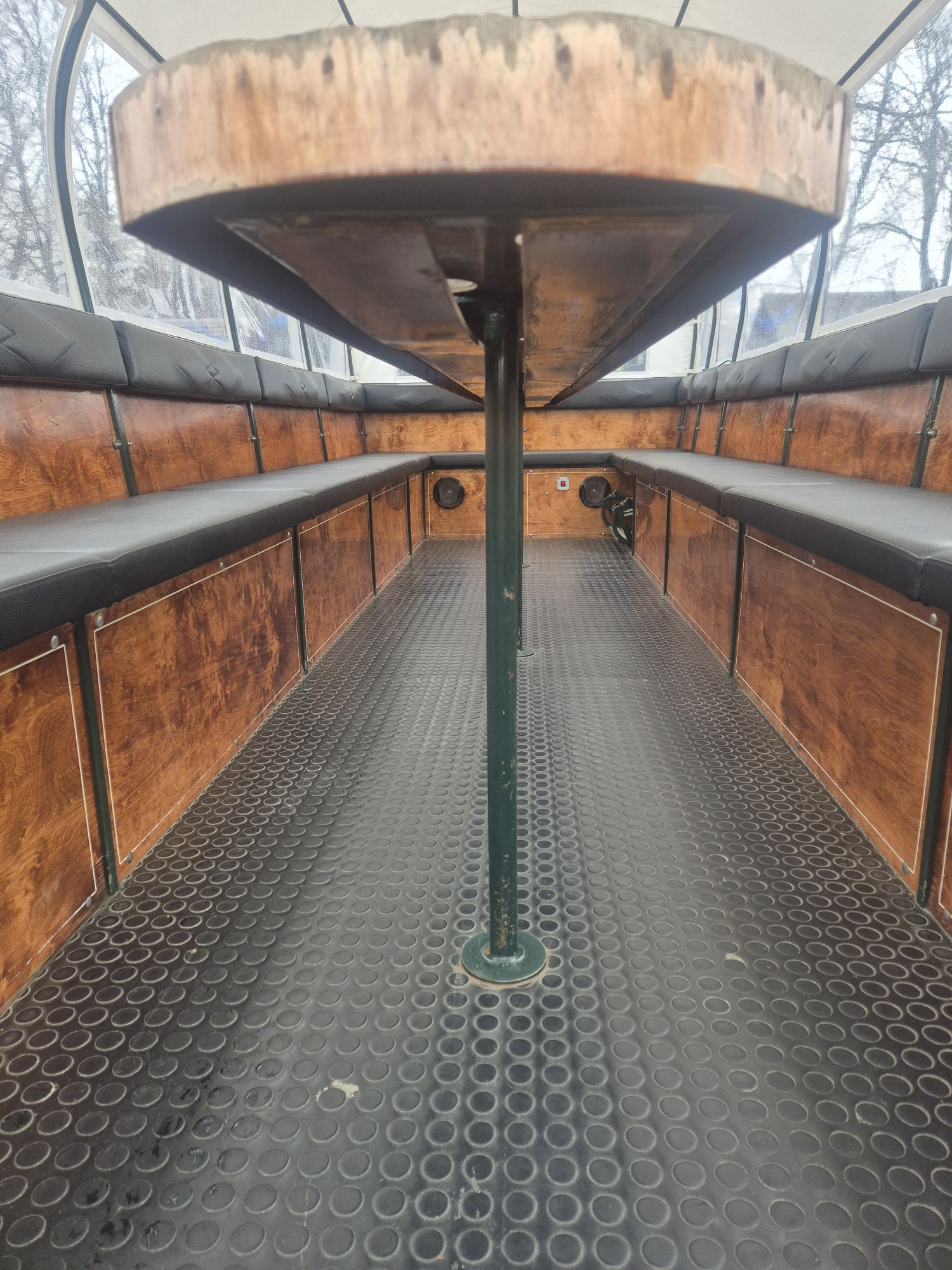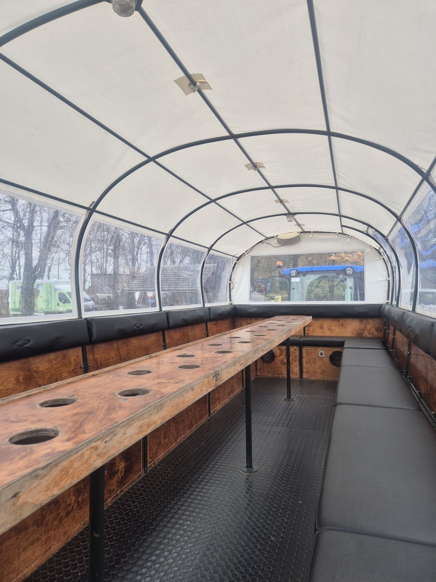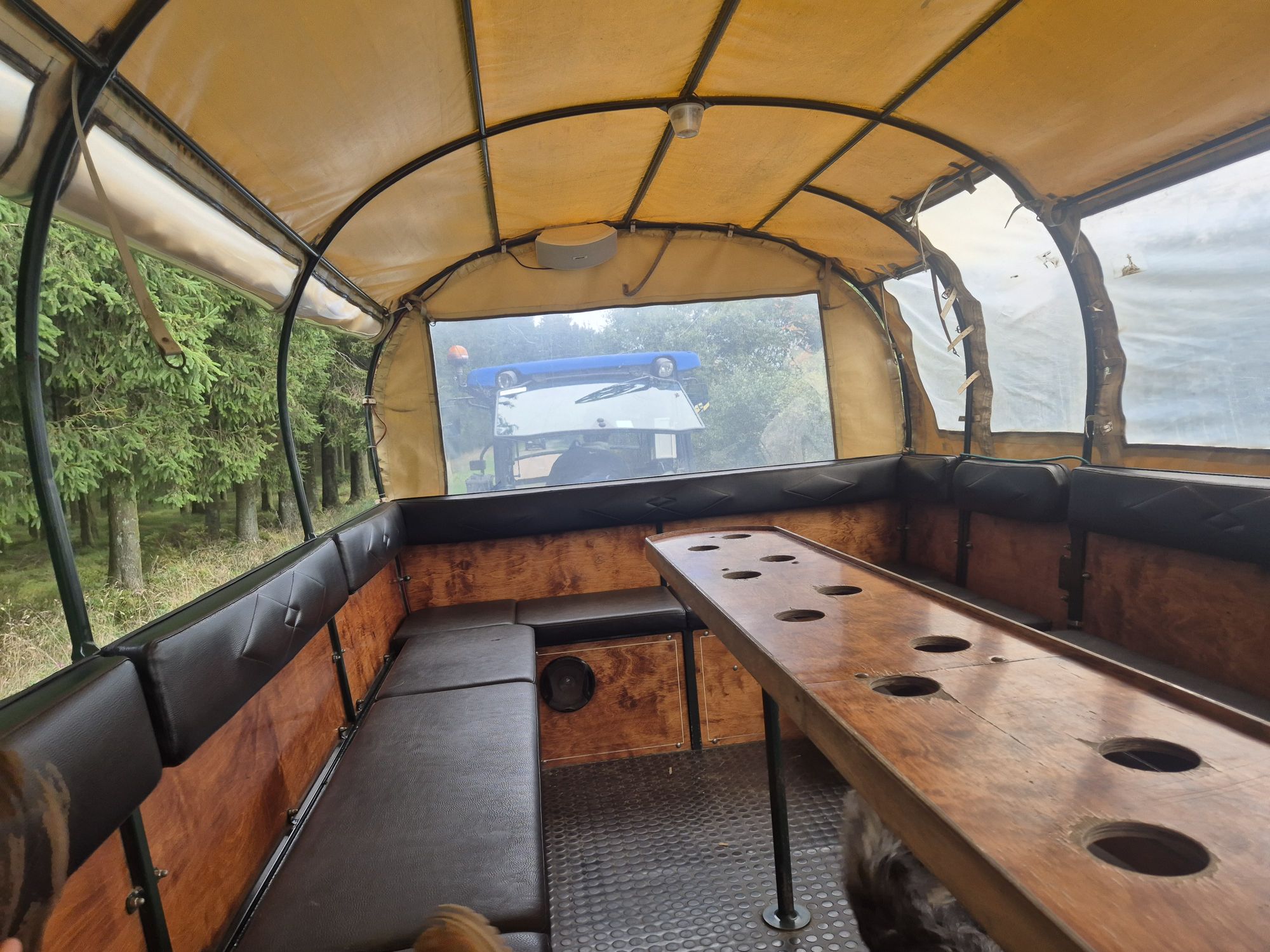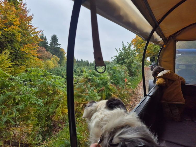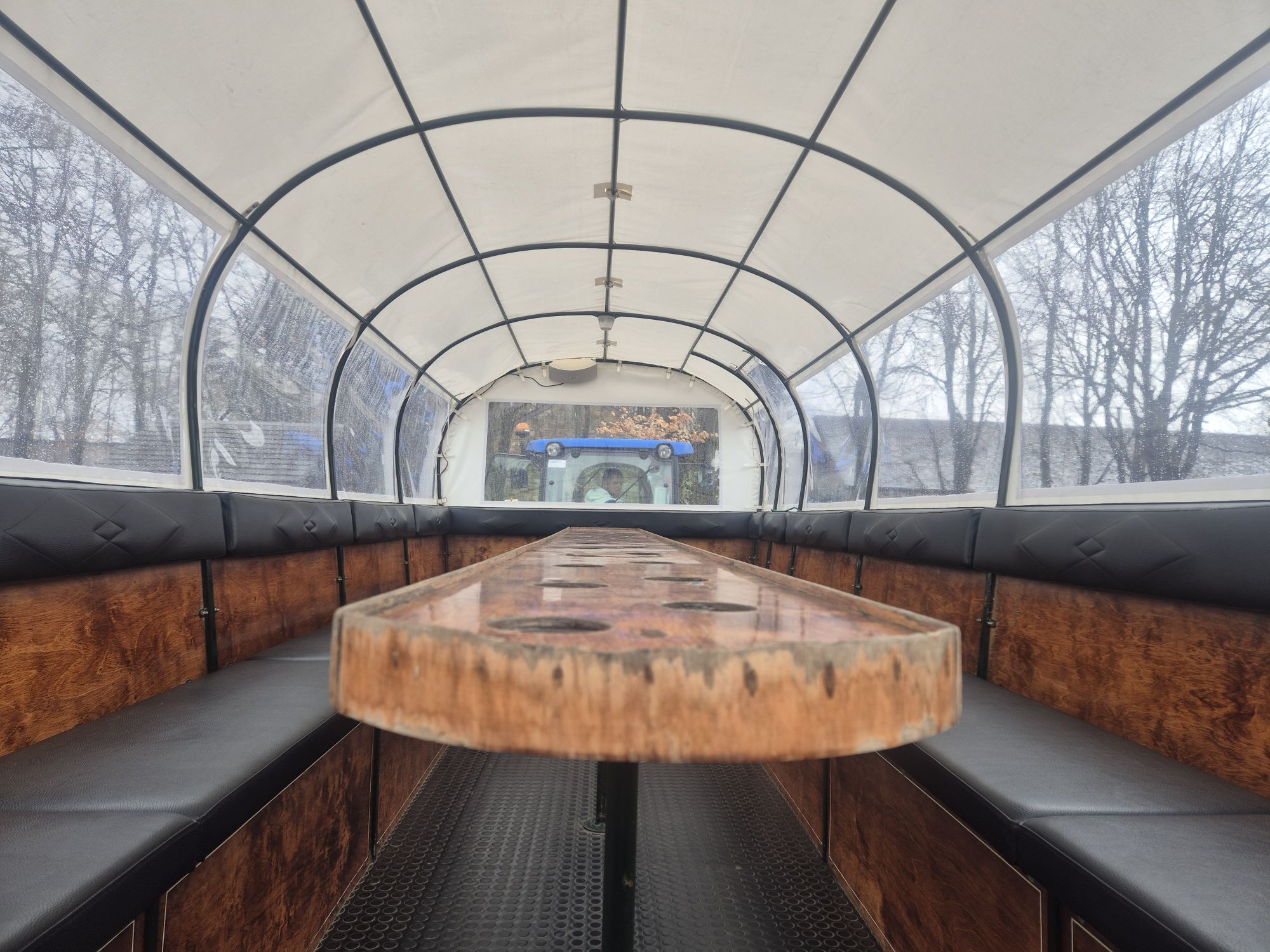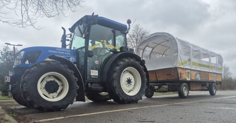 Le char à bancs est tiré par un tracteur du Parc Naturel Hautes Fagnes Eifel. L’intérieur en bois avec ses banquettes en cuir noir a un charme authentique et rustique qu’on ne trouve nulle part ailleurs. Par beau temps la bâche est relevée, par mauvais temps on est abrité. Dans les deux cas, l’aventure est entière.