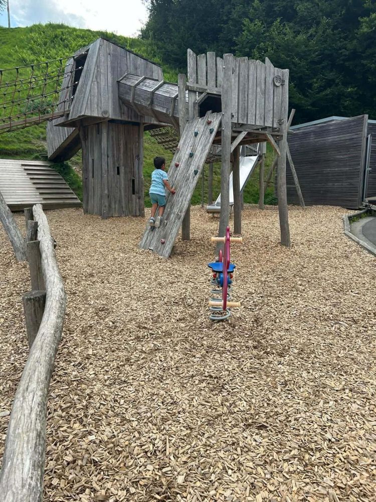 Au point de départ, une grande plaine de jeux avec des structures en forme d’animaux accueille les petits explorateurs. Hayden s’y précipite à chaque fois, c’est devenu un rituel. Sécurisée et originale, elle est accessible librement.