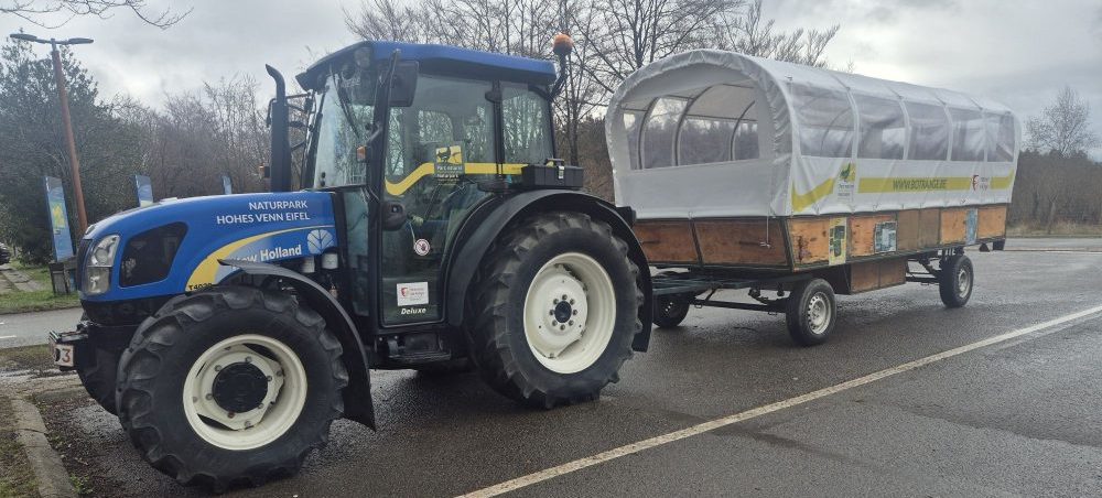 Le char à bancs est tiré par un tracteur du Parc Naturel Hautes Fagnes Eifel. L’intérieur en bois avec ses banquettes en cuir noir a un charme authentique et rustique qu’on ne trouve nulle part ailleurs. Par beau temps la bâche est relevée, par mauvais temps on est abrité. Dans les deux cas, l’aventure est entière.